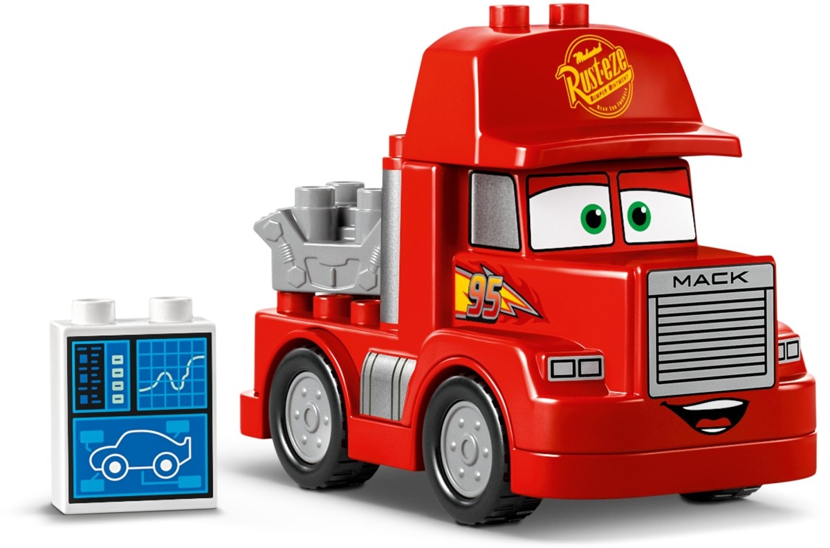 Felturbózott játékidő 2 éves vagy annál nagyobb járműrajongó gyermekeknek ezzel a Mack a versenyen építésre és játékra is alkalmas készlettel, amelyet a Disney és Pixar Verdák című filmje inspirált. Egy nagy, piros megépíthető játék kamiont tartalmaz. A kisgyermekek segítenek Macknek, hogy minden készen álljon, mire Villám McQueen megérkezik a boxkiállásra. A villáskulcs segítségével felturbózhatják az új motorját. Majd segíthe Macknek megnézni Villám eredményeit a számítógép elemen, hogy a versenyautó tökéletes állapotban legyen a többiek legyőzésére.