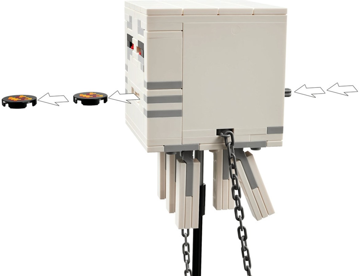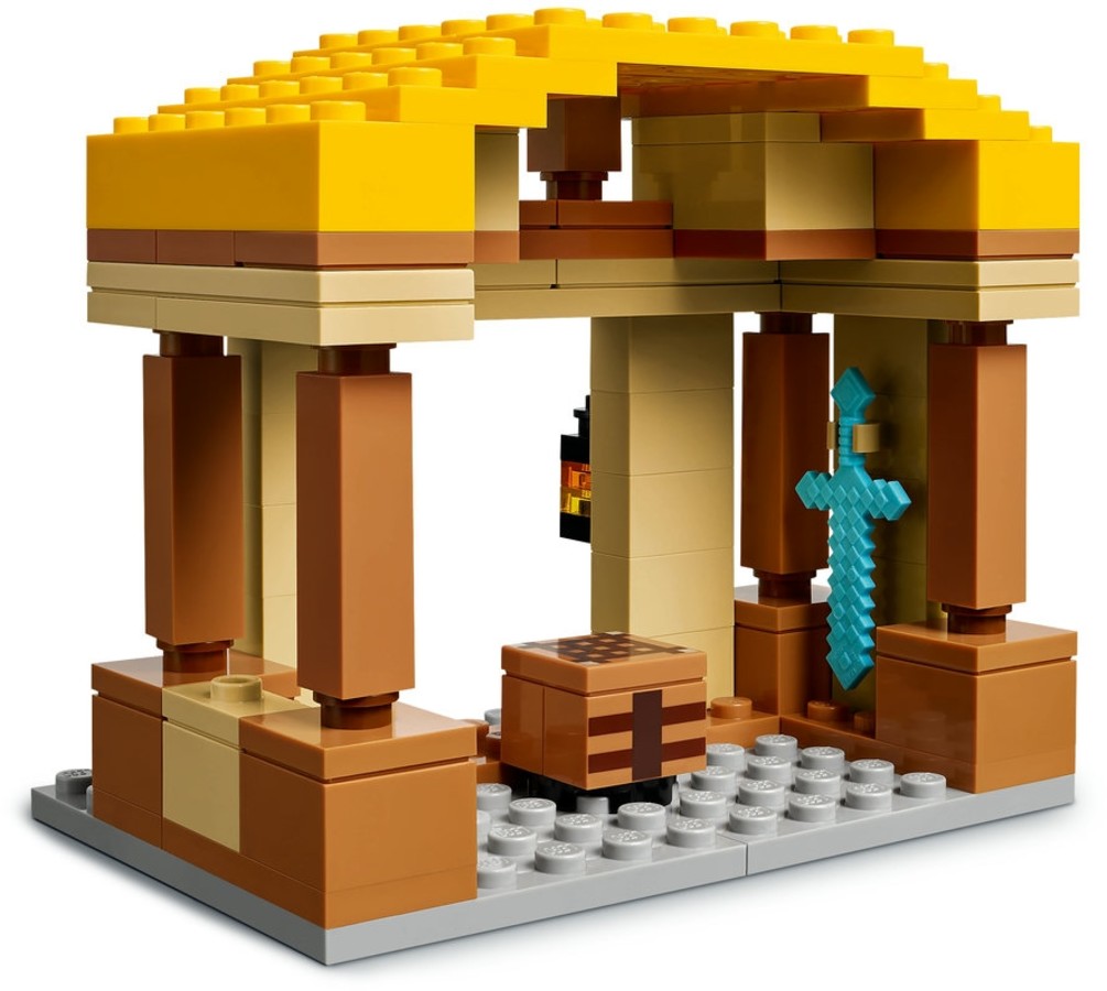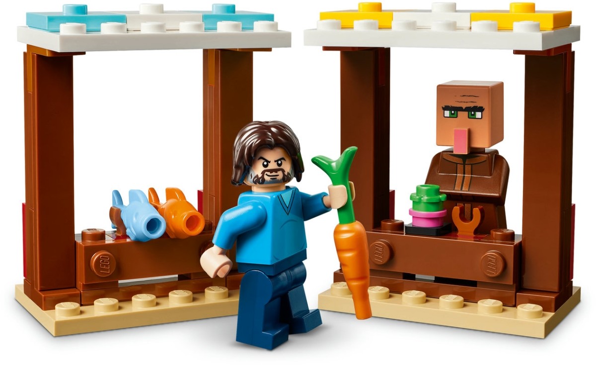 A szellemléghajó és falutámadás egy videójátékos építőszett, amely a Minecraft film egyik jelenete alapján készült. Ez a játékkészlet megörökíti azt a kirobbanó jelentet, amikor támadást indítanak a léghajóból. A készlet a videójátékból ismert szereplőket tartalmazza: Steve, Natalie, Dawn, 2 malacka, egy szellemléghajó, egy falusi, egy kiscsirke és egy beállítható vasgólemfigura. A léghajóban van hely a malackák számára, és van rajta egy korongvető is. A falusi jelentben piaci pultok, Steve sült csirkét áruló étterme, barkácskunyhója, valamint egy szökőkút található, amit a gyerekek egy beépített funkcióval felrobbanthatnak. Az étterem tetején egy hatalmas csirkemodellt találsz, szórakoztató, tojást tojó funkcióval. A digitális élmény érdekében a LEGO Builder alkalmazásban a gyerekek felnagyíthatják és 3D-ben elforgathatják a modelleket, és követhetik a haladásukat.